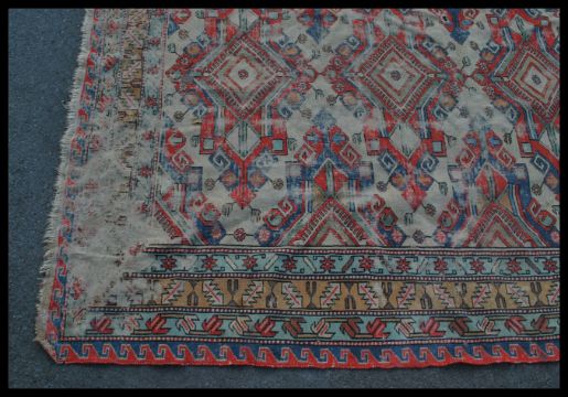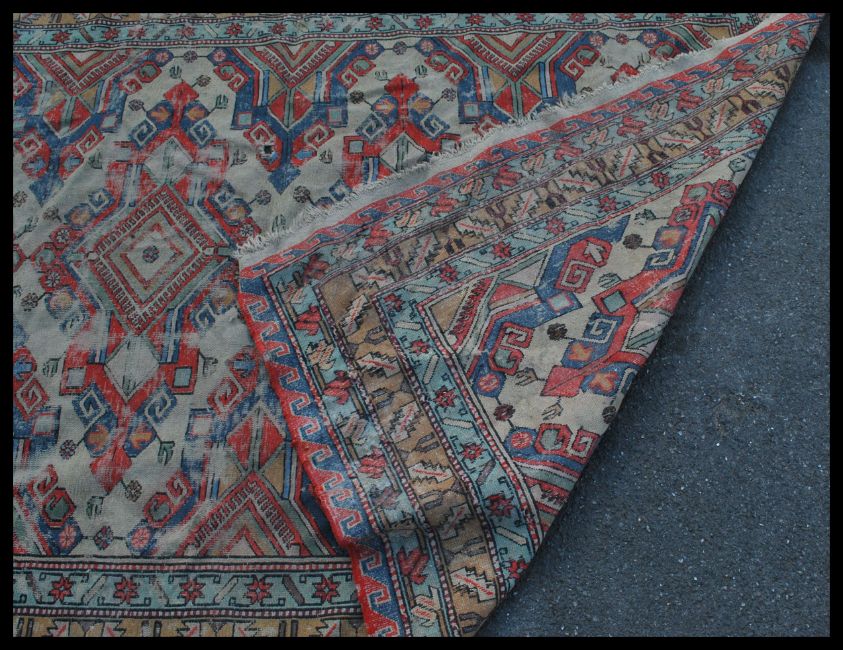 A vintage Persian / Islamic style floor rug on sky blue ground central medallions with geometric borders.