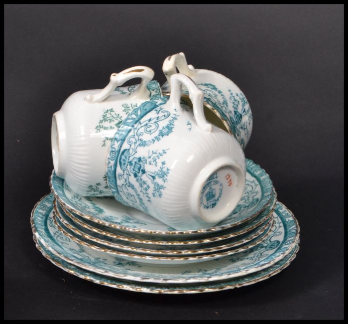 An early 20th century Victorian / Edwardian bone China tea service by Royal Albert in the Eton pattern consisting of cups, saucers, side plates, creamer, sugar / slops bowl etc. \\\stamped to base.