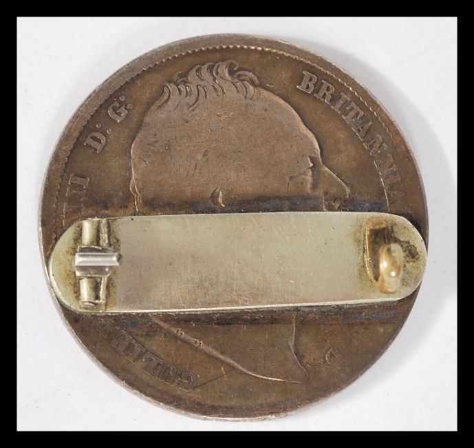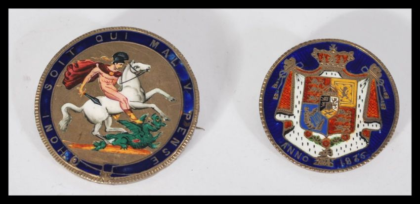 A George III 1819 Enamelled Crown Brooch, Enamel Intact With Odd Scratches together with another George III enamelled coin brooch
