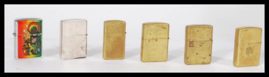 A group of five vintage Zippo lighters to include a VIII E07 1932-1987 etc. Along with another.