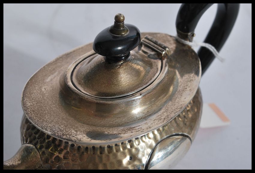 An early 20th century silver hallmarked Arts and Crafts movement teapot having a hand beaten hammered design with shaped bakelite handle and finial lid. Rubbed hallmarks present believed Birmingham 1903. Weighs gross 242 grams.