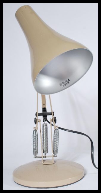 A vintage 20th century Herbert Terry anglepoise desk lamp being raised on circular terraced base with a pendant shade in taupe / Beige colourway. Measures 86 cm high.