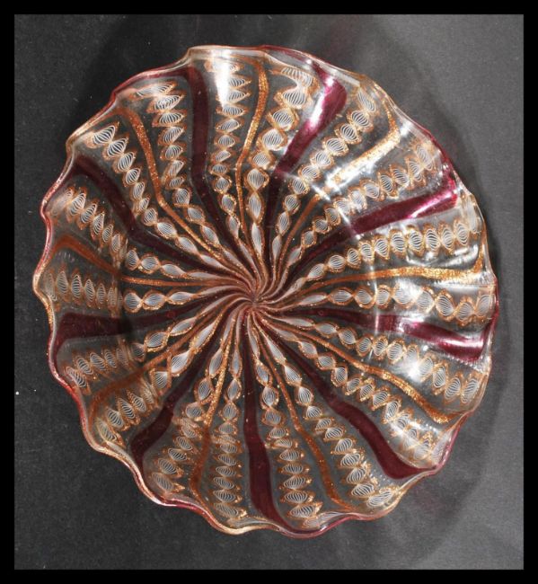 A 19th century Venetian glass bowl of scalloped form having hand painted red lines with gilt swirl double helix decoration. Measures 4 cm high and 19 cm diameter.
