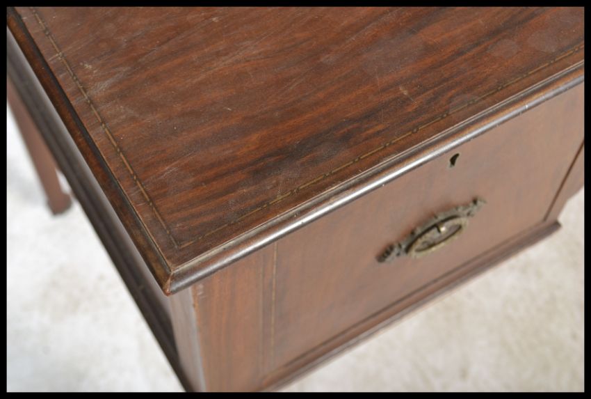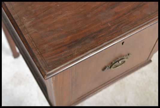 An Edwardian mahogany dressing table being raised on tapering square legs with castors having a set of 3 frieze drawers. Above a further set of trinket drawers with swing mirror over pierced gallery