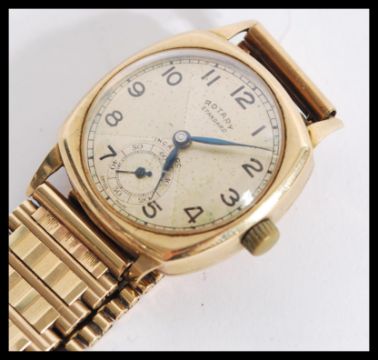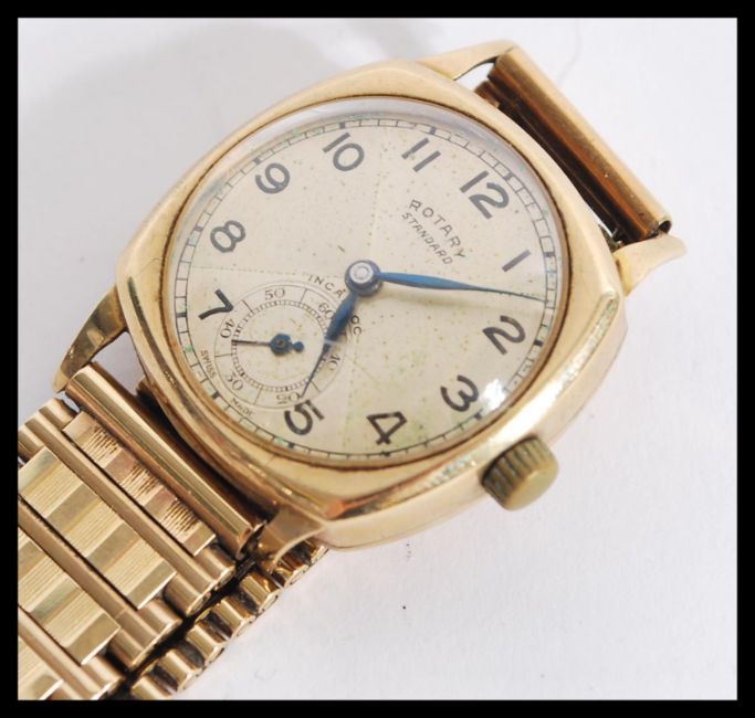 A vintage Gents 9ct gold Rotary wristwatch set to a 9ct gold hallmarked bracelet strap. The Rotary Standard face with sub dial and faceted hands. Verso inscribed for William Edwin Nicholas Searle 1905 - 1947. Total weight 42.8g
