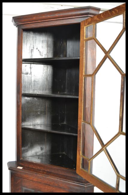 A good quality Edwardian oak Astragal glazed double free standing corner cabinet with panelled door to base cupboard