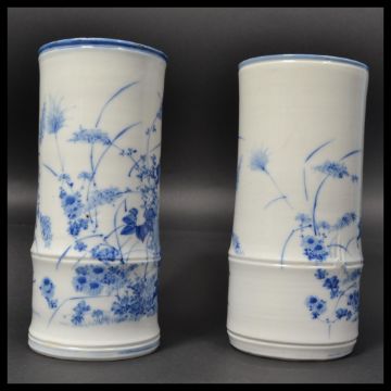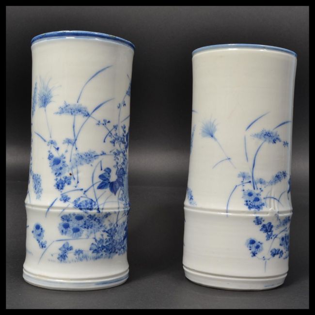 A pair of 19th century Chinese blue and white ceramic tall bamboo effect brush pots / vases hand painted with scenes of flowers and trees. Measures 24.5 cm high.