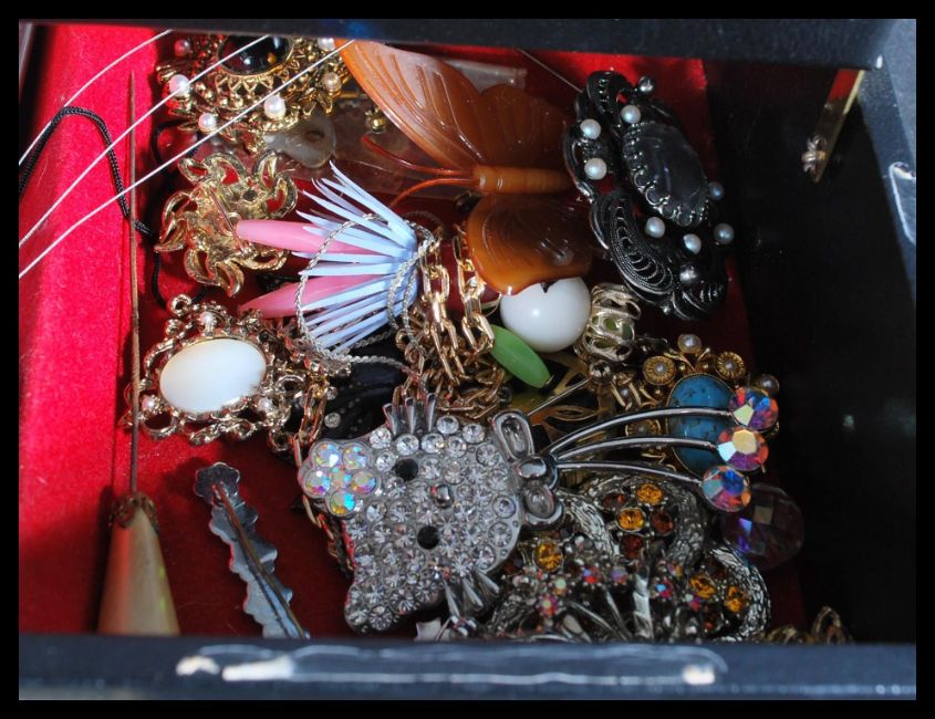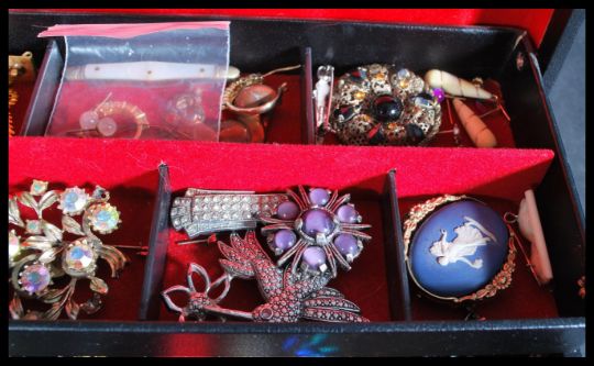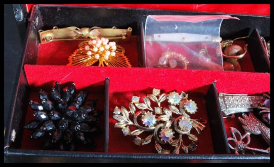 A collection of vintage early to mid 20th century costume jewellery to include gold and silver examples. Brooches necklaces , earrings etc. All within a vintage jewellery box.