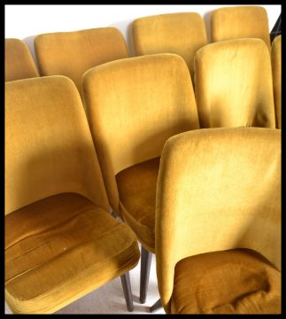Ben Chairs ' Benchairs ' of Stowe - A set of 10x mid 20th Century retro vintage dining chairs having the beech wood frame and tapering legs upholstered in yellow velour backrest and seat pad.