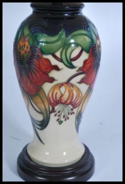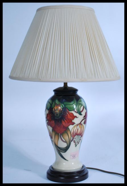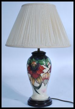 Moorcroft pottery table lamp, baluster-shaped with tube-lined decoration of various flowers together with a hand made silk shade. (Including the shade) measures 54 cm high.