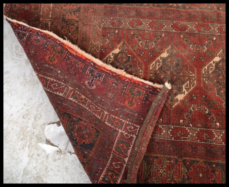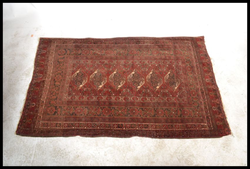 A good early 20th Century Kelim floor rug / carpet on red ground, large central geometric panel with stylised geometric borders