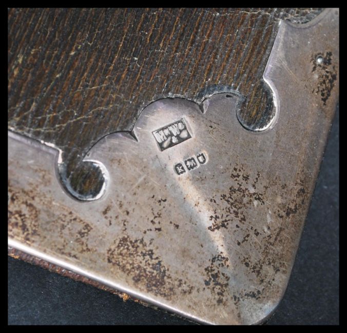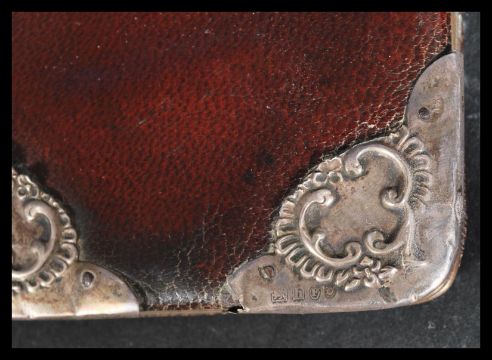 A group of 19th / early 20th century desc items to include a leather and silver hallmarked cornered Mappin and Webb folio , a oxblood leather and silver hallmarked mounted aide de memoire , a continental silver pen with relief floral decoration and a miniature Victorian rosewood tea caddy that could be used as twin capstan inkwell.