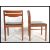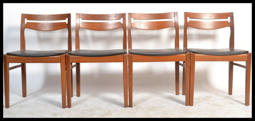 A retro mid century teak wood set of  Nathan dining room  chairs with pierced railed back rests set over squared legs and black vinyl seat pads