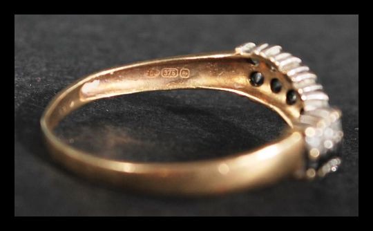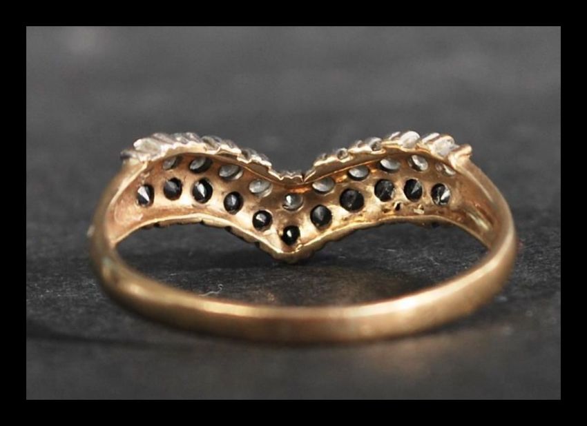 A hallmarked 9ct gold wishbone ring set with sapphire and diamonds. Diamonds approx 33pts. Hallmarked Birmingham. Weight 1.2g. Size N.5.