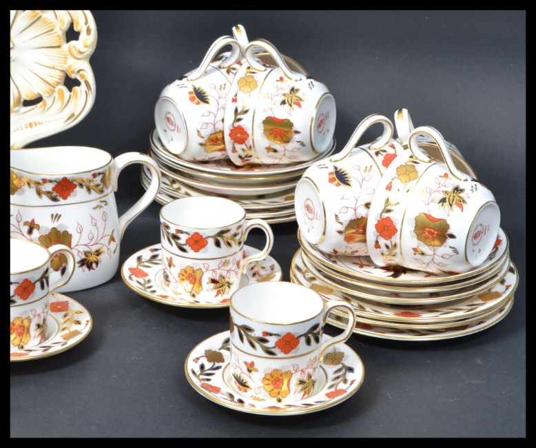 A Royal Crown Derby Imari pattern china tea service comprising cups, saucers, plates, teapots, creamer, bowl etc. Measures 23 cm high.