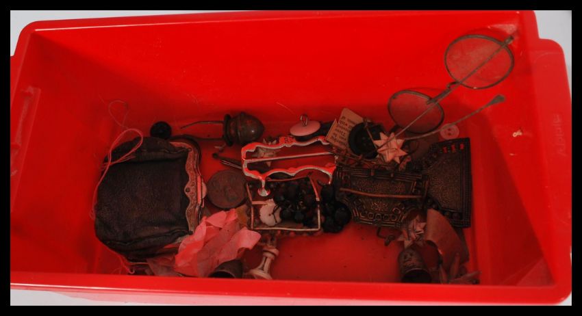 A collection of antique and vintage curios to include silver hallmarked dressing table brushes, paperweights, costume jewellery, mourning Jewellery, Charles Horner silver Thimble, marbles etc please refer to images.