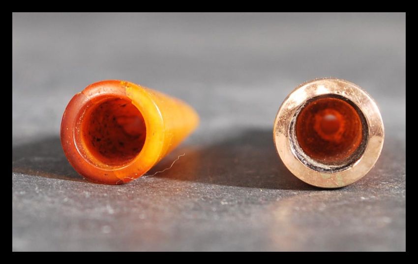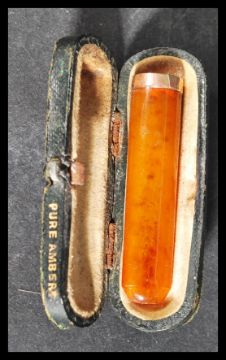 Two early 20th century amber cheroots in original leather cases one having a hallmarked 9ct gold band.
