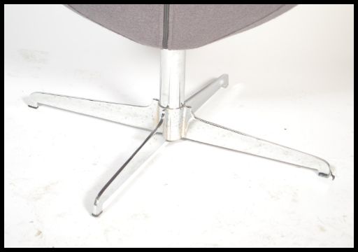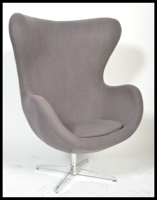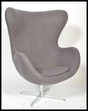 After Arne Jacobsen - A Fritz Hansen style egg chair / lounge / easy armchair in a taupe velour upholstery raised on a four point steel base. The original being designed in 1958. Measures 120cm high x 80cm wide.