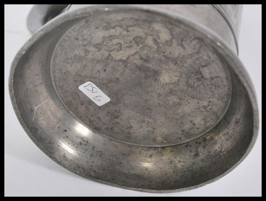 AN 18th century George III Georgian tankard stein guild flagon gibe to an apprentice in farming with hammer and sickle design. Finial handle lid with inset coin
