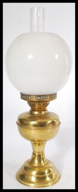 A vintage early 20th Century brass oil lamp complete with flue and milk shade fitted with a Duplex double burner. Measures 50 cm high.