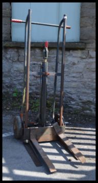 A pair of vintage / retro 20th Century industrial metal tubular forked sack trucks fitted with a pneumatic lift, having adjustable forks