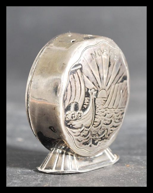 A Norway silver salt / pepperette of circular form with chased decoration of Viking longboats to each side with inscription reading Norge. Makers stamp and 830s to base.