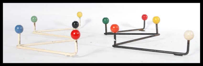A pair of vintage retro 20th century Sputnik Atomic coat hooks having coloured ball finial ends. One finished in white and the other in black.