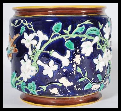 A 19th century Victorian planter / jardinière / vase in the manner of George Jones having relief decoration of hummingbirds and flowers. Measures 19 cm  high and 20 cm diameter.