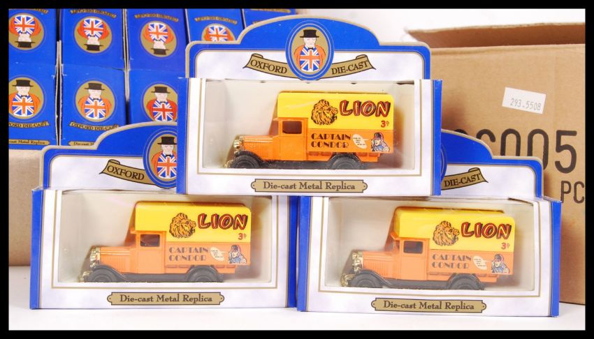 Two new / old ex shop stock trade boxes containing 24x Oxford diescast model advertising vehicles for lion to each. All 1:43 scale in original packaging contents within in mint condition.