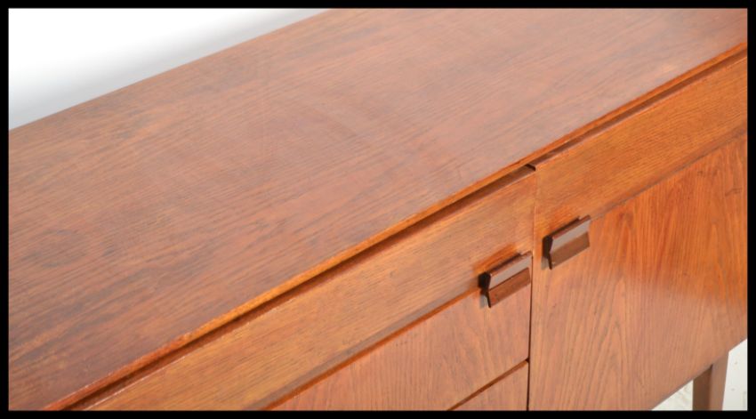 A 1970's Danish teak wood sideboard being raised on tapered legs with a series of drawers and cupboards having square lozenge handles to the fronts