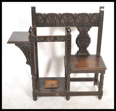 A 19th century Victorian carved oak Jacobean revival hall settle seat chair of unusual form having a central stick umbrella stand with chair to one end. Please see images.