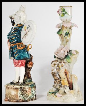 Two 19th century Victorian ceramic figurines to include a Ernst Bohne & Sohne pair of owls on candlestick with flowers and leaves along with a boar man figure holding a shield with inscription to front. Impressed marks to base. Highest measures 22.5 cm.