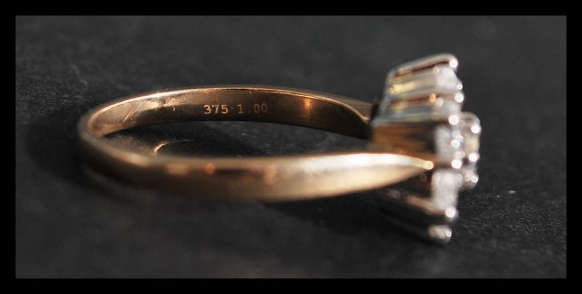 A hallmarked 9ct gold and diamond cluster ring. Diamonds approx 1ct total. Hallmarked London. Weight 3.1g. Size L.5.