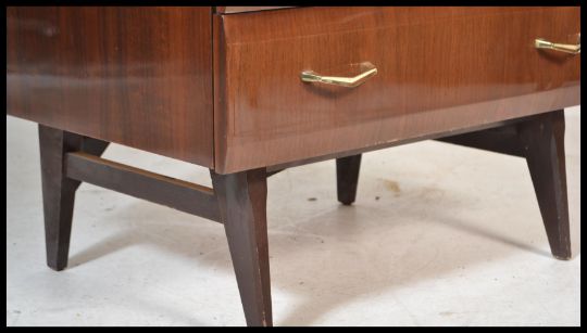 A retro mid century lacquered chest of drawers and dressing table having decorative handles and shaped drawer fronts, the dressing table with shaped mirror atop. Measures: 113cm high x 65cm wide x 46cm deep.