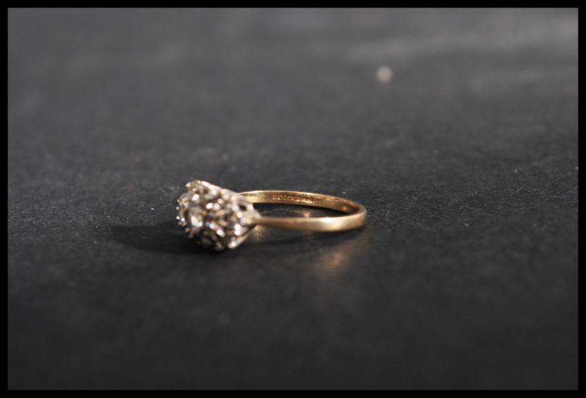 A hallmarked 9ct gold cluster ring set with white stones. Hallmarked London. Weight 2.4g. Size Q.5.