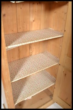 A Victorian large 19th century country pine housekeepers cupboard raised on a plinth base having a series of shelves within and behind a full length door