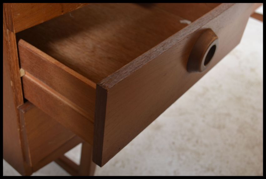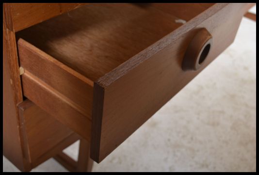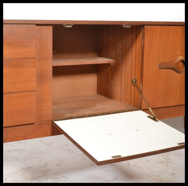 A retro teak wood Danish inspired sideboard circa 1970's having a series of cupboards and a bank of three drawers raised on shaped supports. Measures: 72cm high x 182cm wide x 44cm deep.