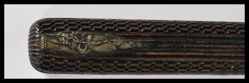 An early 20th century silver and bronze mounted pen case of elongated form having detailed applied mounts.