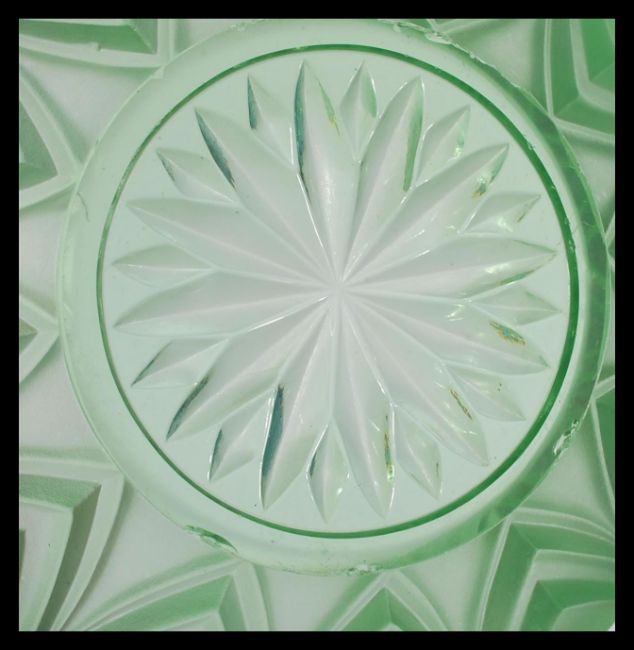 A six person uranium glass dessert set to include six bowls, large serving bowl, side plates and a larger plate in green with a frosted finish dating to the early 20th Century.