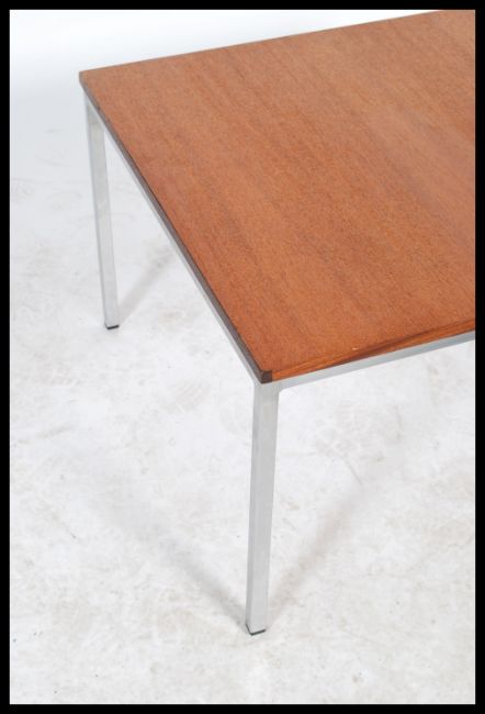 A late 20th Century vintage industrial teak wooden topped coffee / side table raised on a squared tubular steel section inspired by merrow associates. Measures: 40cm high x 61cm wide x 61cm deep.