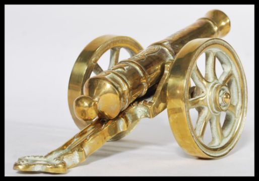 An early 20th century heavy cast brass desk top cannon dated 1812, Moving wheels with detachable cannon. Measures 13 cm high, 14 cm wide and 29 cm deep.