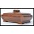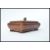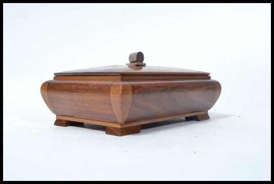 A good 20th century wooden tobacco box of sarcophagus form raised on square stub feet with log final lid. Measures 13 cm high, 25 cm wide and 18 cm deep.