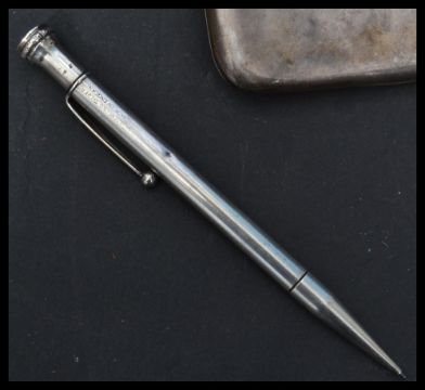 A silver hallmarked cigarette case, Birmingham assay mark, makers mark for Frederick Field and dating 1923 together with a silver hallmarked Georgian teaspoon with London assay mark, makers mark for Samuel Hayne & Dudley Cater dating to 1836 and a sterling silver propelling pencil. Cigarette case measures 8 cm high and 10 cm wide, pen measures 12.5 cm long and the spoon measures 15 cm long.