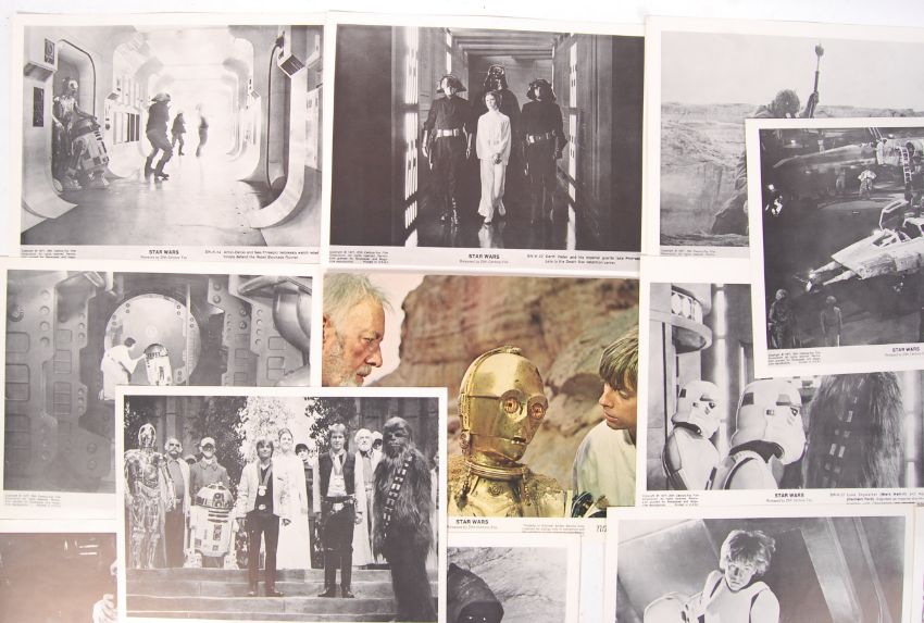 A rare believed full set of vintage 1977 black and white ' Star Wars : A New Hope ' lobby cards / film stills. All dated 1977. All 8x10" in black and white. Along with 1x vintage 1977 colour lobby card / film still depicting Obi Wan, C3PO & Luke. Rare collection.