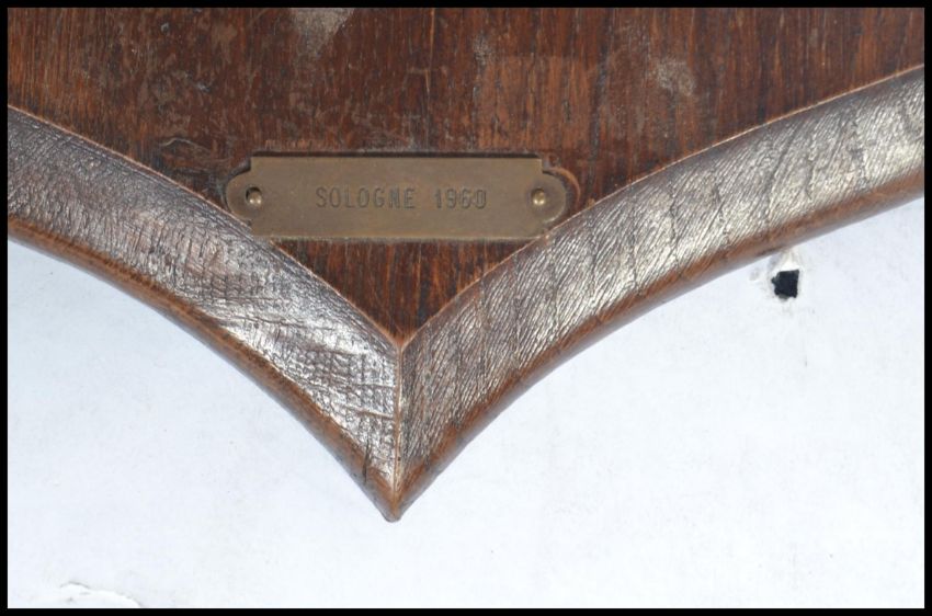 Taxidermy Interest. A French mid 20th century large taxidermy boars head being mounted onto an oak armorial shield shaped back plate with notation plaque for Sologne 1960 36cm.