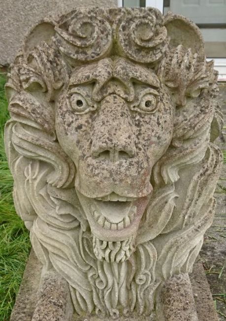 An exquisitely carved large 20th Century reconstituted stone recumbent Lion. The detailed head of the lion raised with mouth open with a magnificent mane, set to a plinth base. Please note collection only from Saltford Bath.