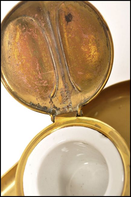 A 19th century brass pen tray with fitted inkwell having a top hat ceramic liner with feather and bird claw intaglio seal.