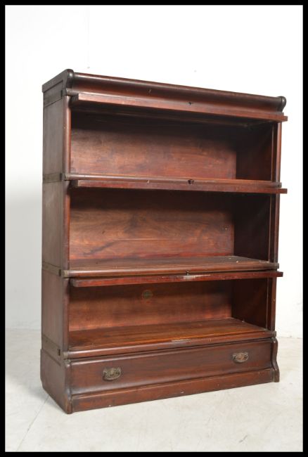 An early 20th Century Globe Wernick mahogany floor standing three sectional glazed lawyers bookcase, each section fitted with up and over glazed doors, raised on a plinth base with inset drawers, applied makers label to the cabinet. Measures: