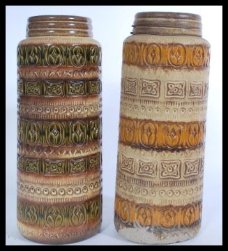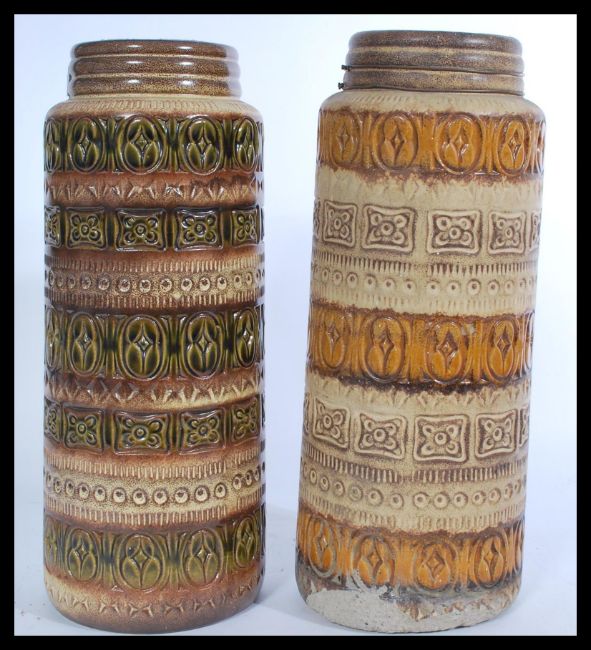 A pair of vintage retro 20th century West German ceramic fat lava style vases of tall form. Highest measures 42 cm.