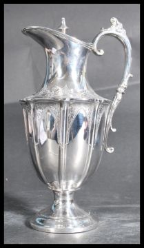 A 19th century Victorian silver plated EPBM claret jug raised on a stepped circular base with gadrooned sides, etched decoration and scrolled handle.